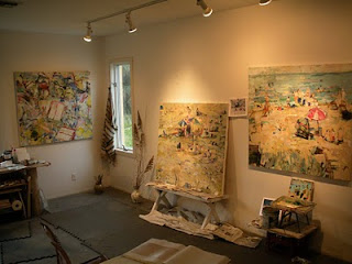 My studio is back to being a work space. The painting on the end wall is titled "Party Cake". I'm working on two canvases of people on the beach. A small canvas is sitting by the paint tray. I did it to work-out some of the details before going onto the large surface.